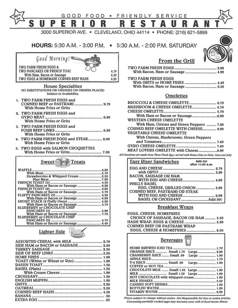 Welcome to Superior Restaurant, a hidden gem located at 3000 Superior Ave E in Cleveland. This deli and sandwich spot offers a variety of mouthwatering options, including the famous corned beef sandwich that has guests raving. The enthusiastic reviews from customers like Merrill J., Glenn N., and Melissa J. highlight the exceptional quality and generous portions of their dishes.